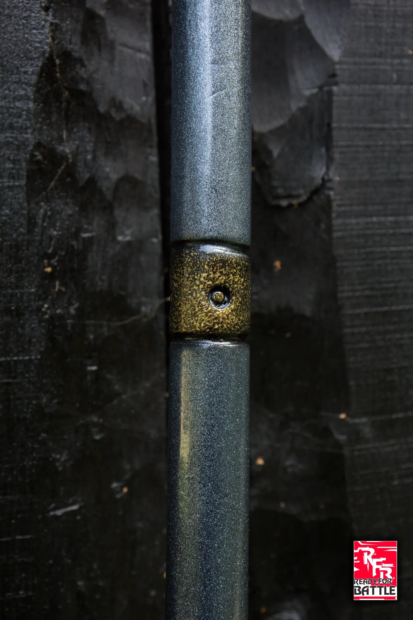 This bestselling Ready For Battle Staff is a 190 cm long wooden staff with four iron metal braces – one at either end, and two others along the staff. The braces are 4 cm wide with impressive detailing, including dents beneath sculpted nail heads used to secure the brace to the pole.