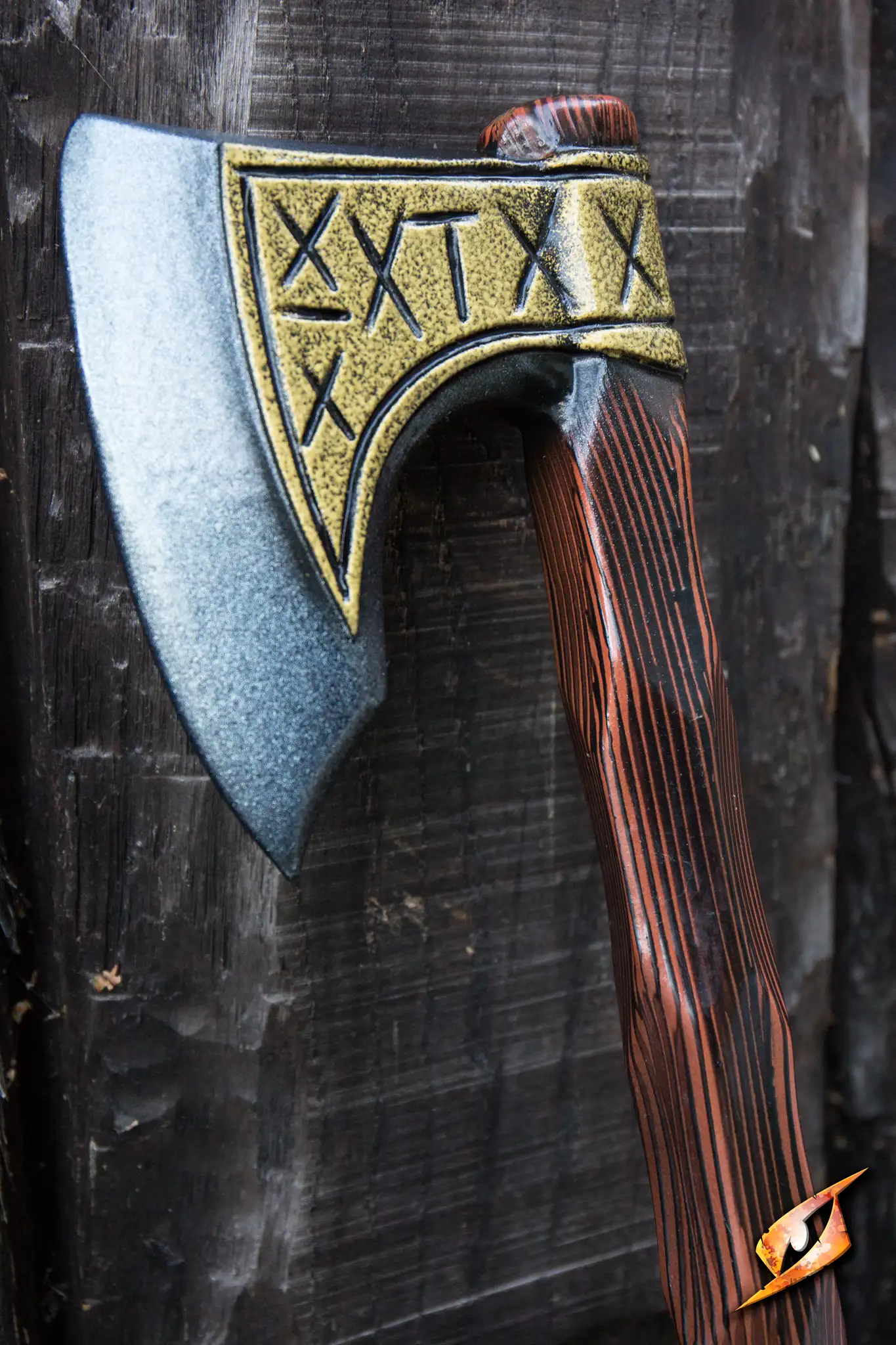 Epic Armoury’s new improved version of the bestselling Viking Short Axe is reinforced to make it even more durable. The axe-head has a 18 cm edge and a golden embellishment that matches the pommel. The handle is 45 cm long and carved to look like rough wood grain without a specific grip, encouraging the user to make use of the axe’s versatile design.